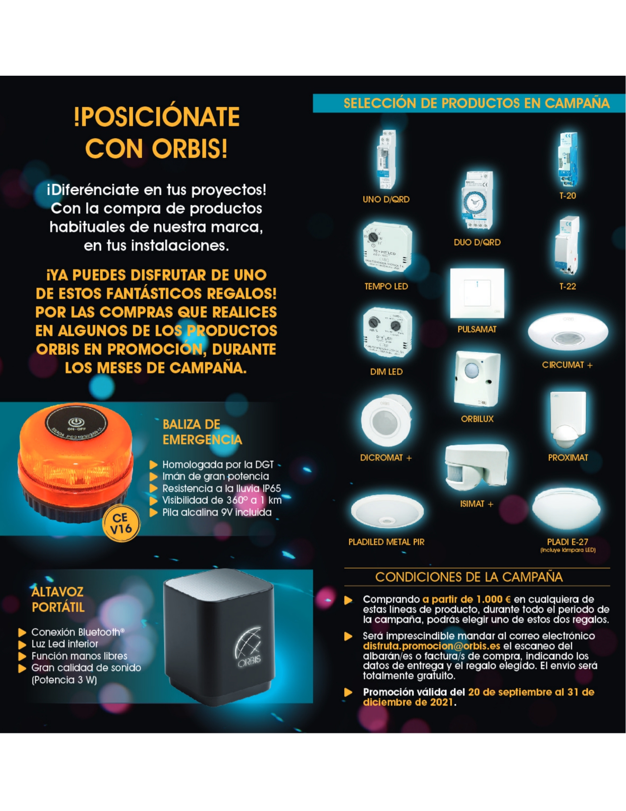 ¡ANÍMATE YA A PARTICIPAR! Podrás elegir entre un fantástico ALTAVOZ BLUETOOTH PORTÁTIL o una práctica BALIZA DE EMERGENCIA, al realizar tus compras en cualquiera de los productos ORBIS en promoción, durante los meses de campaña. Promoción válida del 20 de septiembre al 31 de diciembre de 2021